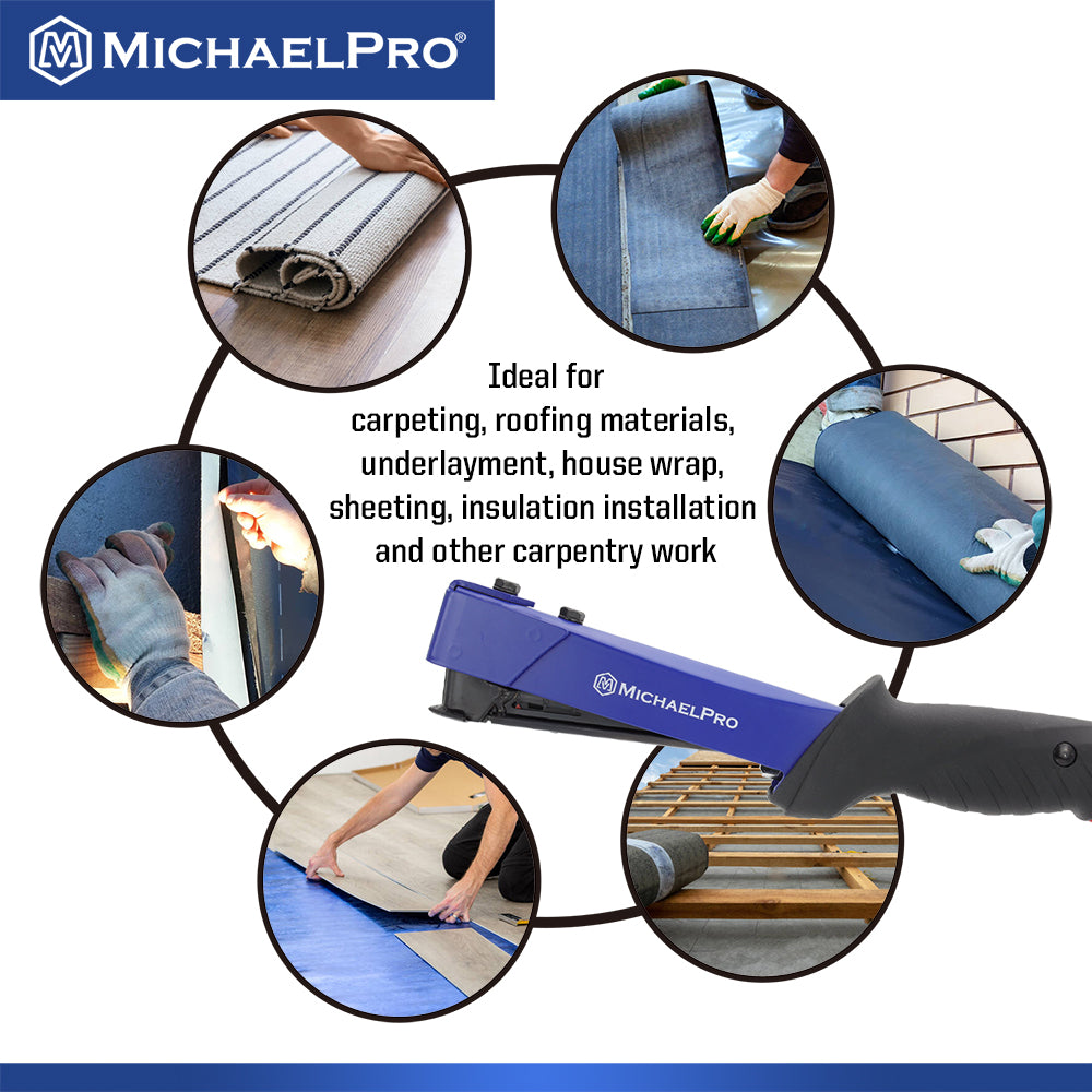 MichaelPro MP004027 is a heavy duty hammer tacker, includes T50 staples that the rear load holds two full sticks of Arrow T50 (1/4-inch, 3/8-inch, 1/2-inch) heavy duty staples, providing solutions to a various range of needs.