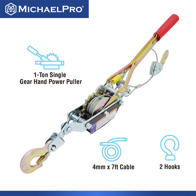 MichaelPro MP009087 is a 1-ton power winch puller with single gear, 1-Ton Hand Power Hand Winch with a 4mm x 7ft Cable and 2 Hooks. As well as a Slip-resistant handle grip for comfort and better grip.